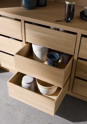 A highlight of Häcker’s design evolution is the SlimLine drawer “SLD” system, now included as a standard feature. This exceptionally sleek pull-out system boasts a narrow metal frame measuring just 8 mm thick, making it a standout design element that often goes unnoticed. The SLD drawer unit is enhanced with integrated lighting, ensuring optimal visibility even in the furthest corners. Combined with the new OrganiQ interior organisation system, this innovation provides a stylish and efficient solution for keeping kitchen essentials neatly arranged.