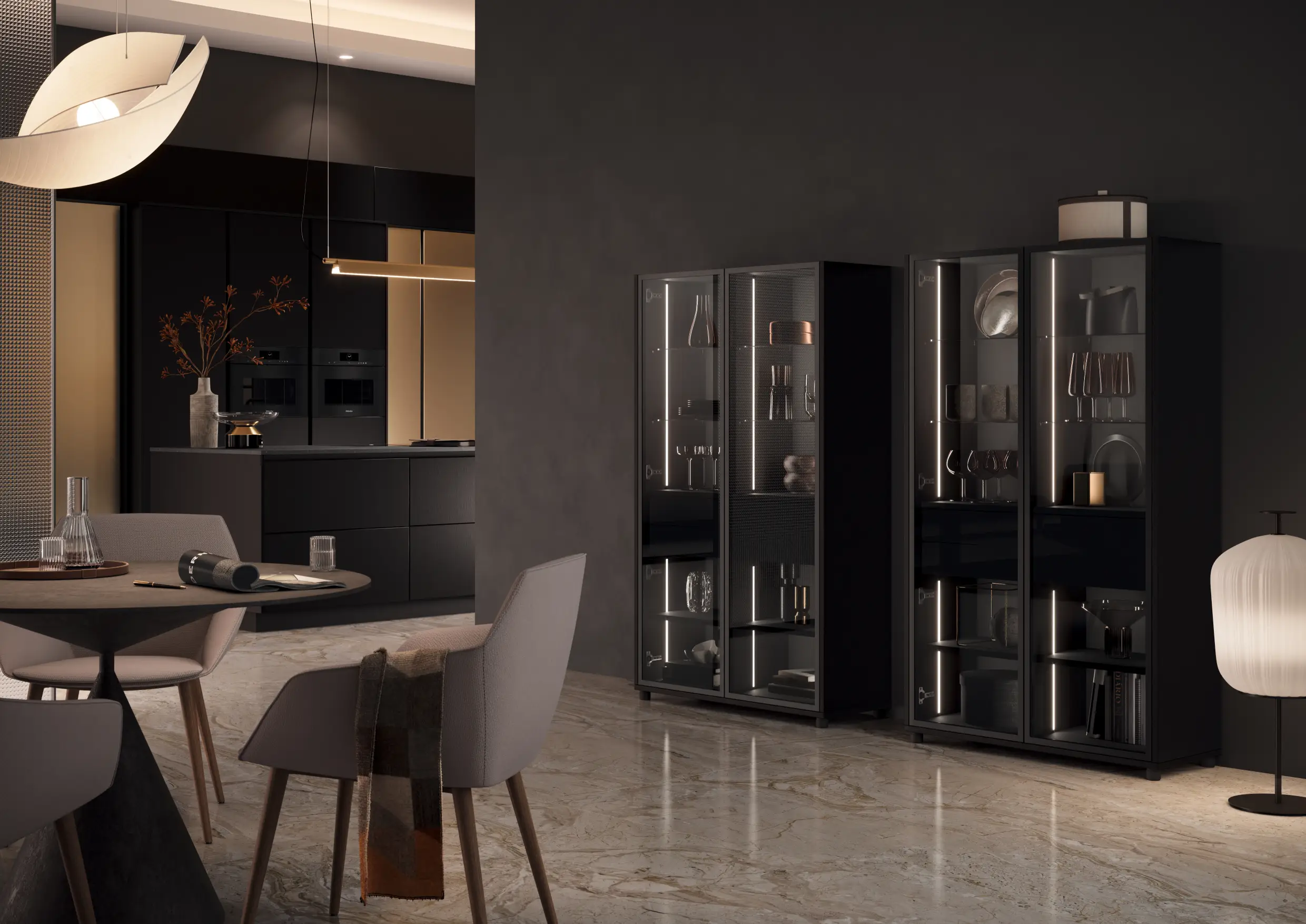 The moment you choose a material, the kitchen begins to feel real. Running your hand across a warm oak surface, the cool precision of a lacquered door, the way light moves softly through frosted glass in the evening, these are the kitchen details you live with every day.
